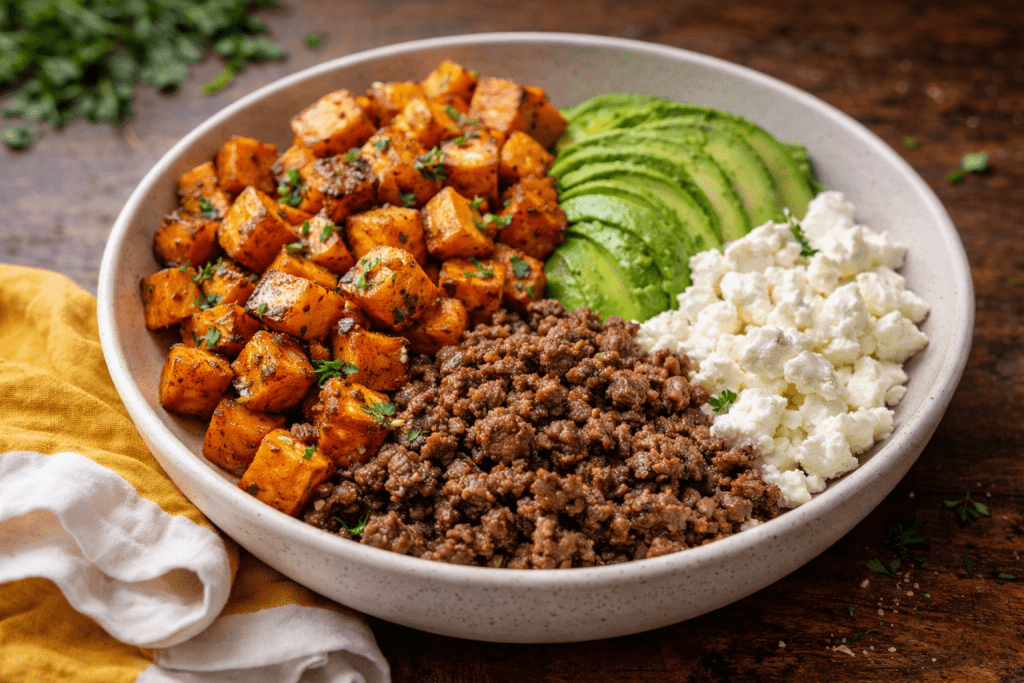 Sweet potatoes bring natural sweetness and a creamy interior when roasted. Beef brings richness, depth, and protein. Together, they balance each other in a way that feels intentional.